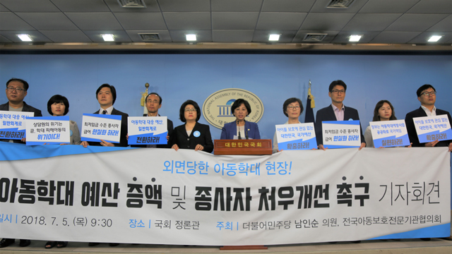 전국아동보호전문기관협의회와 남인순 의원은 오늘(5일) 오전 국회에서 기자회견을 열고, 아동학대 신고접수, 현장조사와 조치, 사례 관리 등을 맡는 상담원의 인건비가 1인당 연간 2천7백3만 원에 불과하다며, 최소한 사회복지시설 종사자 인건비 지급 기준 수준으로 현실화해야 한다고 주장했습니다.